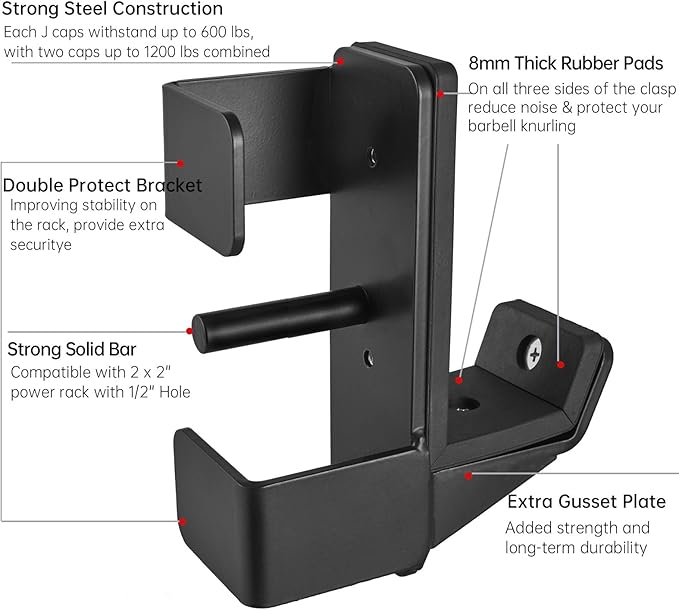 • 【UHMW & Double Protect Bracket Design】 featuring three piece UHMW plastic on all three sides of the clasp to protect your barbell knurling and reduce noise during workouts, left and right double arm for improving stability on the rack, enjoy a smooth and safe lifting session with these j hooks.
