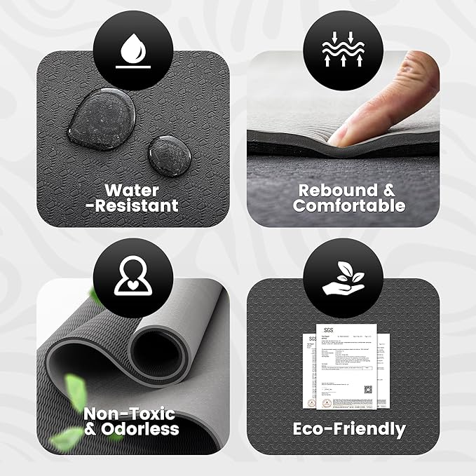 • Upgraded TPE Material: Crafted from premium TPE material, this big home gym mat is free from phthalates and has no unpleasant smell. Compared to NBR and PVC mat, TPE has a nice density. It provides ample cushioning without excessive sinking, aiding in the maintenance of balance during your practice.