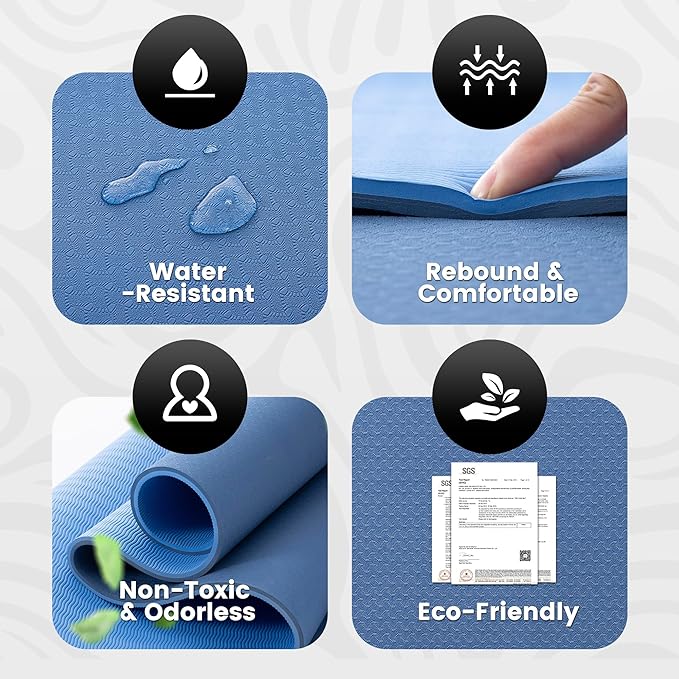 • Upgraded TPE Material: Crafted from premium TPE material, this big home gym mat is free from phthalates and has no unpleasant smell. Compared to NBR and PVC mat, TPE has a nice density. It provides ample cushioning without excessive sinking, aiding in the maintenance of balance during your practice.