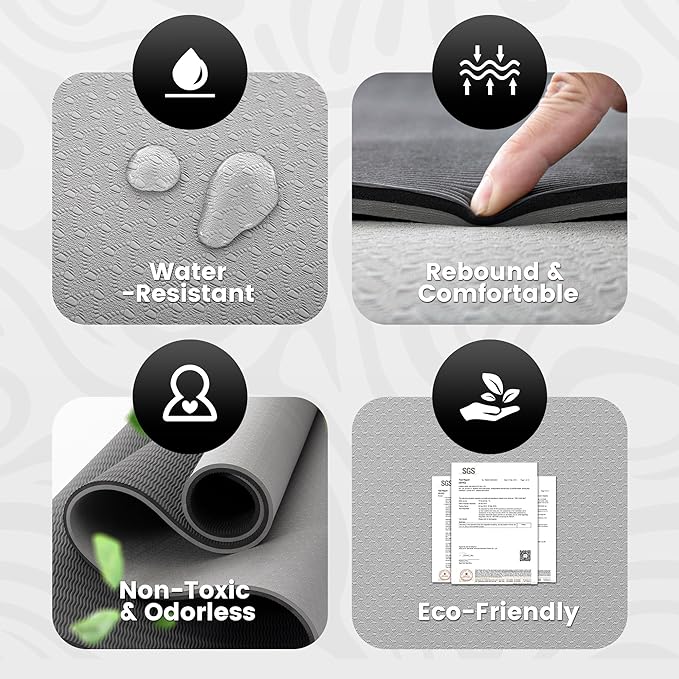 • Upgraded TPE Material: Crafted from premium TPE material, this big home gym mat is free from phthalates and has no unpleasant smell. Compared to NBR and PVC mat, TPE has a nice density. It provides ample cushioning without excessive sinking, aiding in the maintenance of balance during your practice.