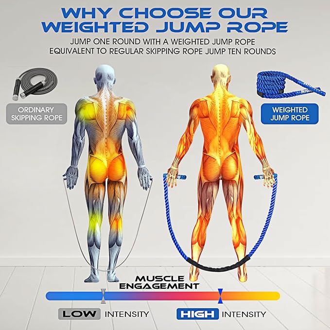 • Ideal Choice for Fitness Exercise:Why choose our weighted jump rope for fitness exercise?Compared to regular jump ropes, the upgraded version of weighted jump rope is the perfect choice for achieving your fitness goals faster.As far as the amount of exercise is concerned, one jump with this weighted jump rope is equivalent to 10 jumps with an ordinary skipping rope, that 10 minutes of jumping with this weighted jump rope is equivalent to 30 minutes of running, Helping you build strength in a short time heavy jump rope workout, Shape your perfect body curves