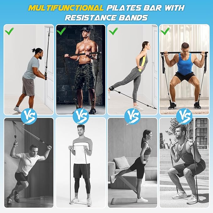 • [Multifunctional Pilates Bar Kit]: Pilates bar set with full accessory upgrades can be used for stretching, fitness and other training programs, exercising your arms, legs, buttocks, waist, neck and back. The perfect tool for building muscle and sculpting your body. 30lbs, 40lbs and 50lbs of resistance bands can be combined into 30lbs to 240lbs of resistance to meet the needs of various exercises. Door anchor, handles, and ankle straps enrich your exercise methods.