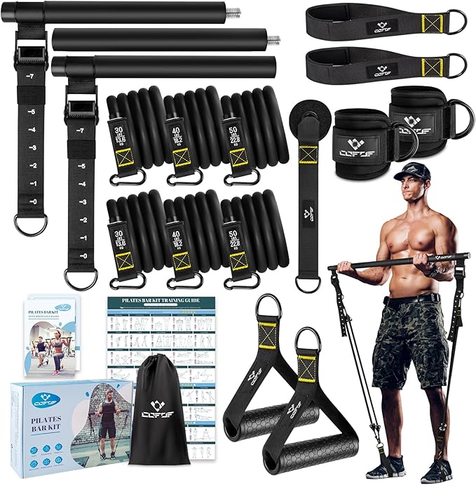 • [COFOF Pilates Resistance Bar Kit]: Our portable pilates bar kit includes 3 sections of solid metal threaded bars, 6 resistance bands can be replaced & combined, 2 handles & 2 foot straps, 1 door anchor, 2 Ankle Straps, and 1 portable bag. We provide pilates bar workout posters and detailed instruction. Any questions about quality or use method, please contact us promptly and we will get back to you within 24 hours. Your complete satisfaction is our ultimate goal.