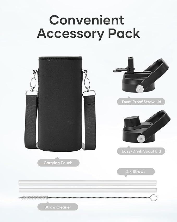• Accessories & Warranty: With every purchase, you'll get a set of practical accessories and a lifetime warranty. The pack includes 1 x carrying pouch, 2 x lids, 2 x straws, and 1 x straw cleaner. This bottle is ideal for camping, hiking, cycling, running, gym sessions, or outdoor work, ensuring you stay hydrated wherever you go.