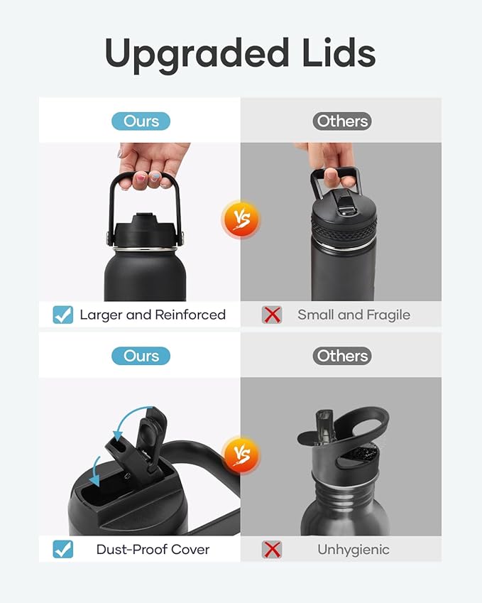 • Upgraded Lids & Handle: This Stainless Steel water bottle features two enhanced lids: a staw lid with dust-proof cover and a easy-drinking spout lid, both equipped with 100% leak-proof seal rings. The reinforced, larger handle offers unmatched durability and portability, making it your perfect on-the-go companion. Also, each lid has a thickened sealing ring, which guarantees 100% leak proof.