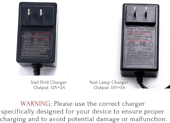 • ATTENTION: E1 Errors Indicate Low Battery. Please Charge Using the Correct Charger with an Output of 15V 3.0A. This Device Will Not Work with the Nail Drill Charger, Which Has an Output of 12V 2.0A.