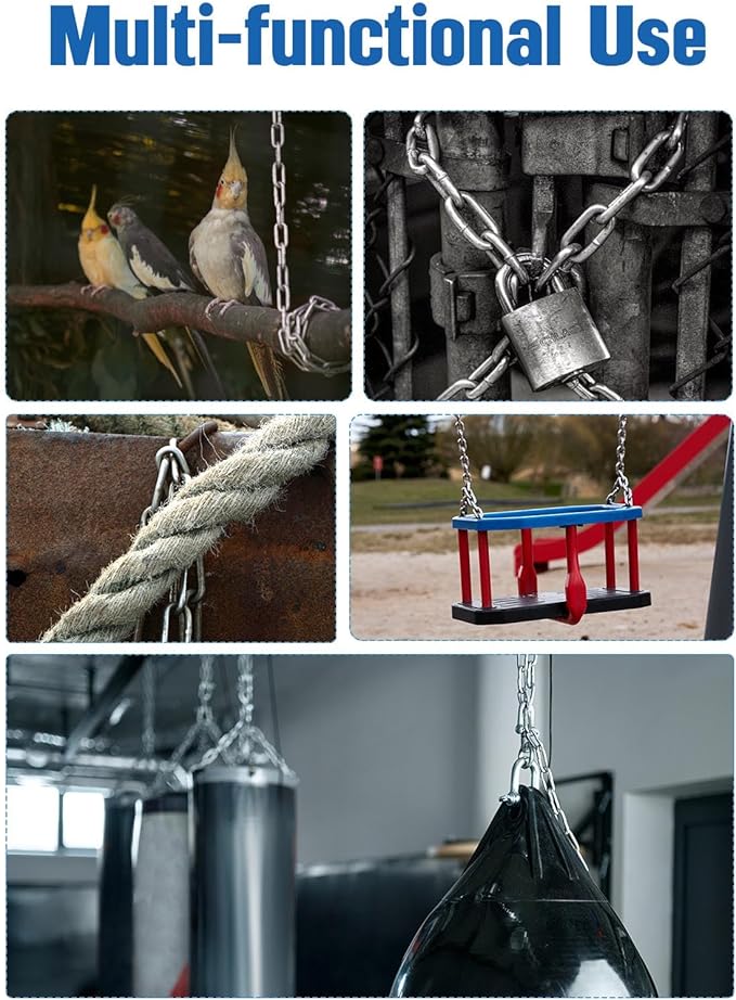 • Multifunctionality: Fitness chains are suitable for fitness equipment of stretching type, lat pull down, power racks, small weight lifting plates. Cable machine extensions can also lock outdoor gates, stables, pet doors and more