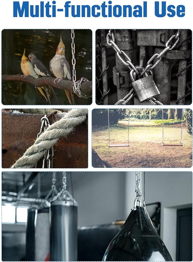 • Multifunctionality: Fitness chains are suitable for fitness equipment of stretching type, lat pull down, power racks, small weight lifting plates. Cable machine extensions can also lock outdoor gates, stables, pet doors and more.