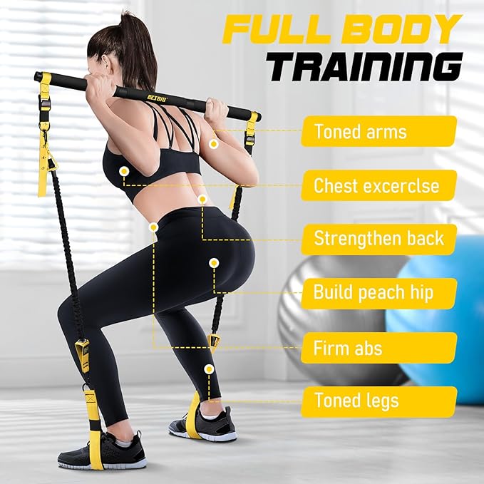 • FULL BODY WORKOUTS: The pilates bar kit with resistance bands can be used for yoga, pilates, stretching, resistance training, squats, weightlifting, etc. Targeting muscle groups in your neck, back, abs, shoulders, arms, upper body, glute, legs. The workout equipment is ideal for strength training, physical therapy, weight loss, body shaping, and flexibility. Great alternative to traditional strength training equipment or exercise equipment, like barbells, rowing machines, and bench presses