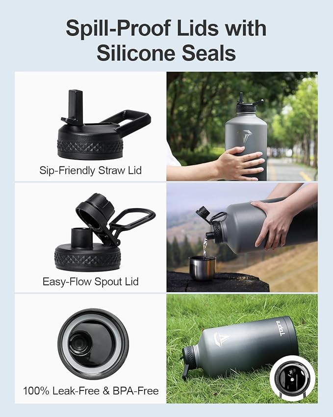 • No Leaks, No Worries: This stainless steel water bottle ncludes two leak-proof lids—a straw lid and a spout lid. Both are equipped with silicone rings to prevent any spills or leaks, and are completely BPA-free for your peace of mind.