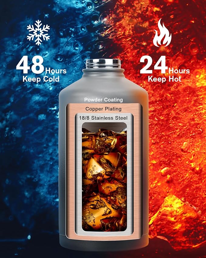• Cold for 48H & Hot for 24H:Topre 128 oz One Gallon Insulated Water Bottle features advanced triple-wall vacuum insulation with copper plating, the water flask preserve the freshness and temperature of your drinks throughout the day.