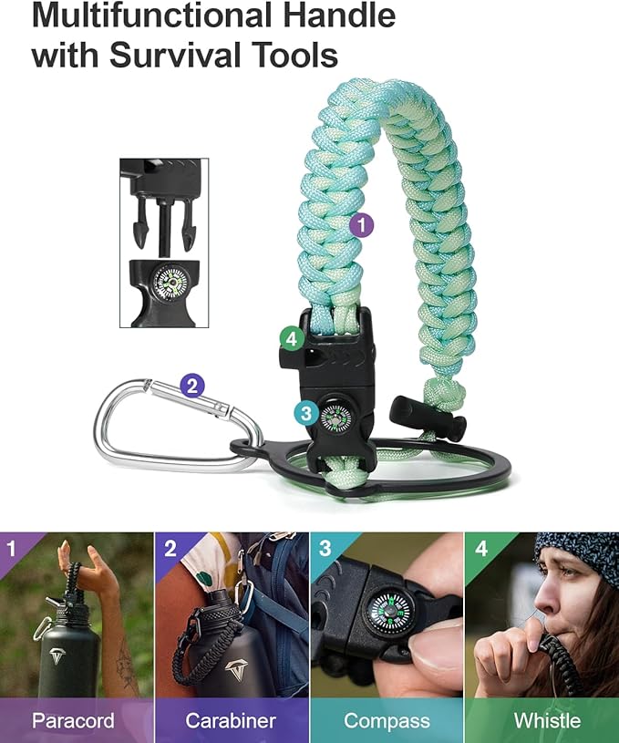 • Ready for adventures: The paracord handle is crafted from sturdy braided rope with an attached survival kit. This includes a compass, a whistle, and a clip, making it an ideal companion for any outdoor activity — be it camping,hiking or exploring new places through travelling.