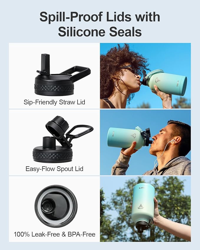 • No Leaks, No Worries: This stainless steel water bottle ncludes two leak-proof lids—a straw lid and a spout lid. Both are equipped with silicone rings to prevent any spills or leaks, and are completely BPA-free for your peace of mind.
