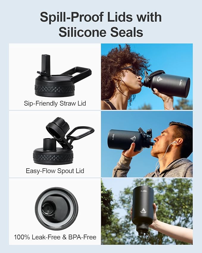 • No Leaks, No Worries: This stainless steel water bottle ncludes two leak-proof lids—a straw lid and a spout lid. Both are equipped with silicone rings to prevent any spills or leaks, and are completely BPA-free for your peace of mind.