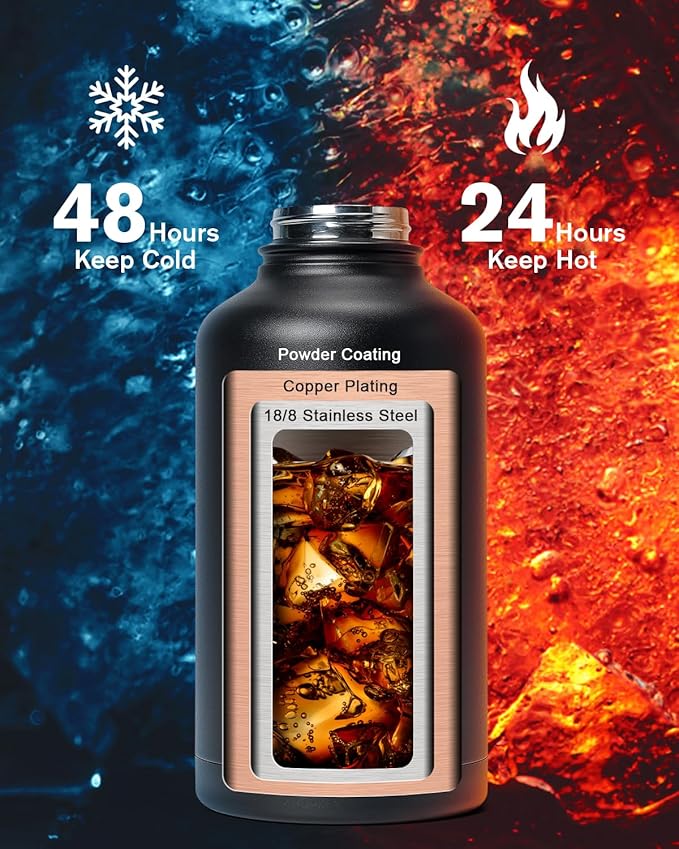 • Cold for 48H & Hot for 24H:Topre 64 oz Half Gallon Insulated Water Bottle features advanced triple-wall vacuum insulation with copper plating, the water flask preserve the freshness and temperature of your drinks throughout the day.