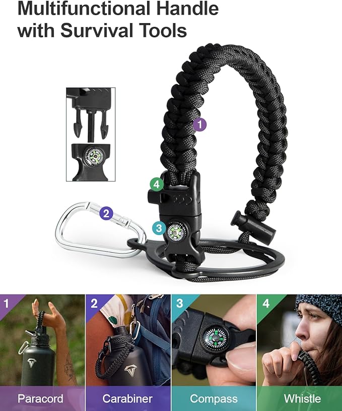 • Ready for adventures: The paracord handle is crafted from sturdy braided rope with an attached survival kit. This includes a compass, a whistle, and a clip, making it an ideal companion for any outdoor activity — be it camping,hiking or exploring new places through travelling.