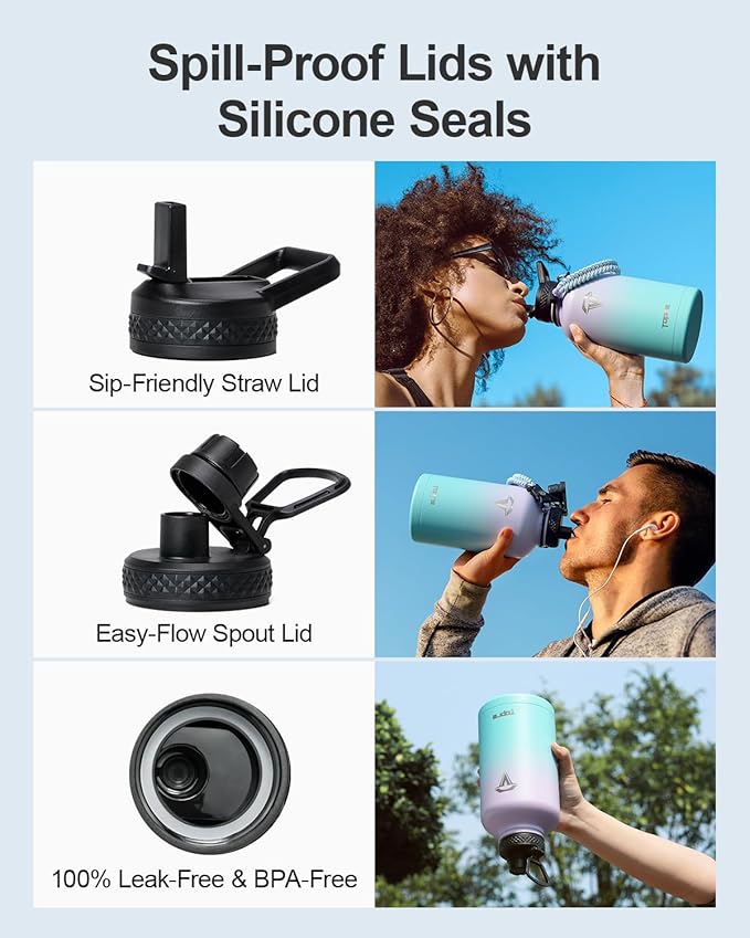 • No Leaks, No Worries: This stainless steel water bottle ncludes two leak-proof lids—a straw lid and a spout lid. Both are equipped with silicone rings to prevent any spills or leaks, and are completely BPA-free for your peace of mind.
