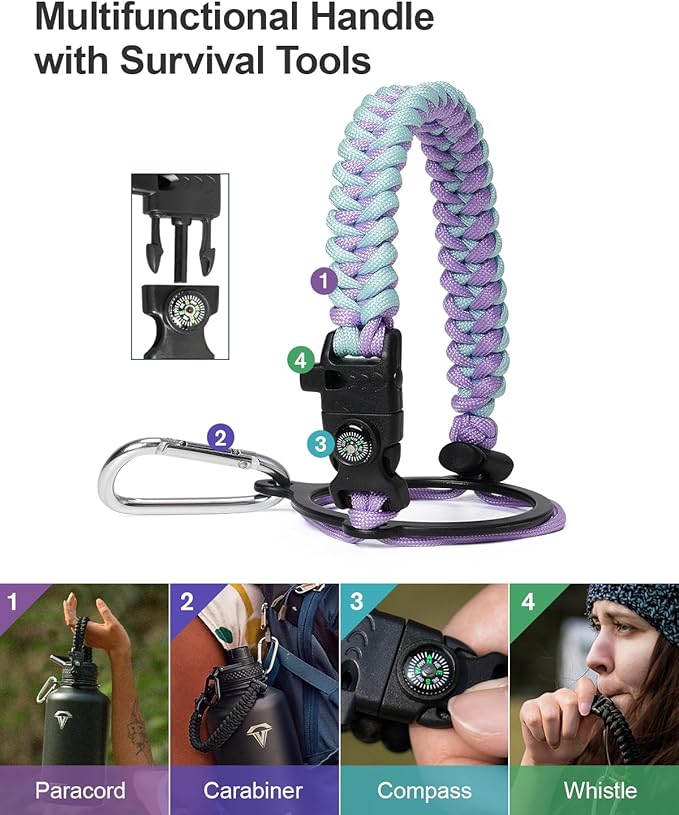 • Ready for adventures: The paracord handle is crafted from sturdy braided rope with an attached survival kit. This includes a compass, a whistle, and a clip, making it an ideal companion for any outdoor activity — be it camping,hiking or exploring new places through travelling.