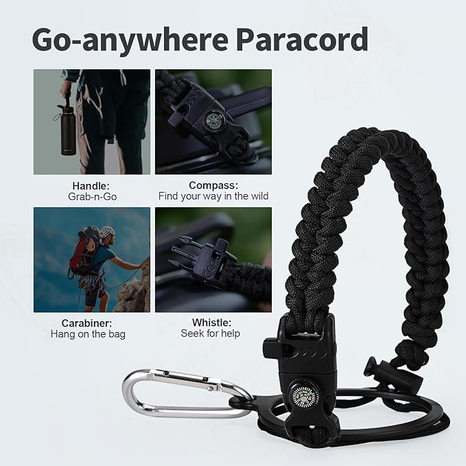 • Palm Fitting Paracord Handle: Compared to handle lids, nylon paracord on the bottle gives you more choices in terms of color coordination and coziness on your hands. Match the handle with your bottle to make a complete outdoorsy look. Compass and carabiner can be lifesavers for hiking and other expeditions