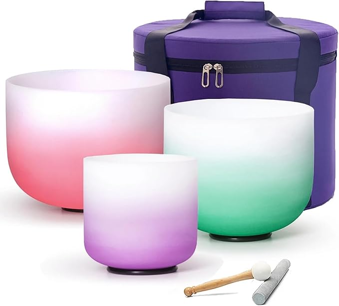 8"B 10"F 12"C Set of 3 Red Green Purple Light Color Singing Bowls Frosted Chakra Quartz Sound Healing Crystal with Travel Carry Case Bag Mallet Suede Striker O-ring