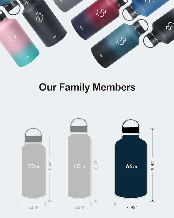 • There is Always One for you: BUZIO insulated water bottle meets your imagination in all aspects of drinking, from the comprehensive sizes (32oz-64oz) to classical and stylish designs, from the production materials to convenient accessories. Come to BUZIO, there is always one for you.