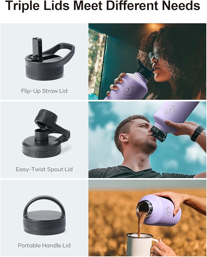 • 3 Caps Pack, 100% Leak-Proof: BUZIO stainless steel water bottle comes with 3 lids: portable handle lid, easy-twist spout lid, and flip-up straw lid to meet camping, hiking, cycling, fitness sports and more. Each lid has a thickened 360° seal for 100% leak-proof.