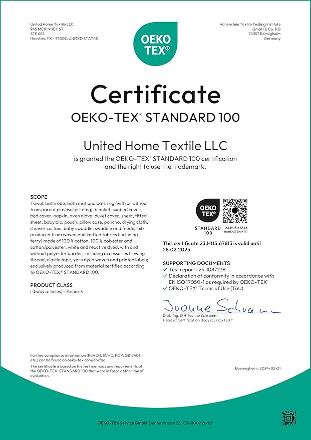 • ✔ OEKO-TEX STANDARD 100 keeps you and your family safe by testing [each component of] a certified product against a list of over 1,000 harmful substances. Certificate #23.HUS.67813 by Hohenstein.