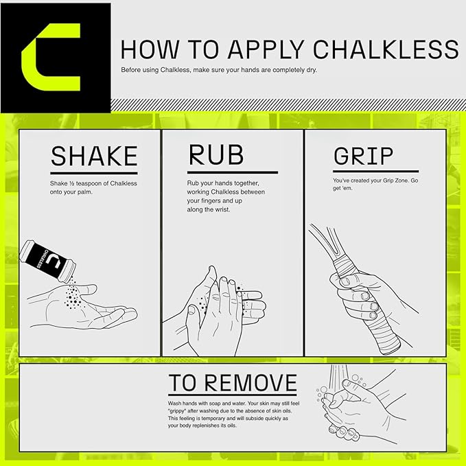 • Safe Formulation: Harness the power of Chalkless non toxic silica silylate compound. Creating an ultra thin, transparent micro coating to enhance both texture and contact surface area making your hand, tennis racket, golf club or pole a grip magnet.