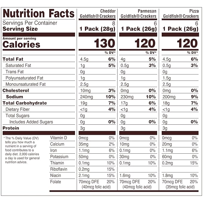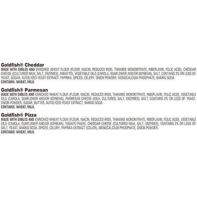 • Variety pack includes: 6 snack packs of Goldfish pizza, 8 packs of Goldfish cheddar, 6 packs of Goldfish parmesan