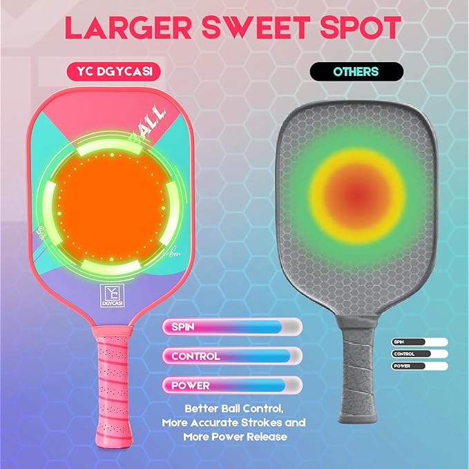 • 【New Thermoformed Paddles Technology】YC DGYCASI pioneering an entirely new technology, the structure of the board is more compact, improves the deformation resistance, and the connection between the board and the top and bottom layers tighter, and the racket surface is not easy to detach. The Polypropylene X24 Core of the racket body provides the best ball cushioning. The carbon friction surface generates unmatched ball spin and defuses your opponent's spin effortlessly and accurately