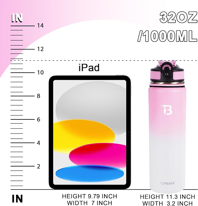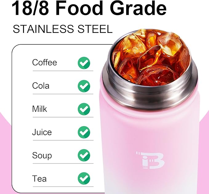 • DOUBLE WALL INSULATION: Our water bottle is made from high-quality 18/8 food-grade stainless steel, rust-proof, BPA-free, lead-free, and easy to wash. This wide mouth water bottle features double-walled vacuum insulation, which can keep your beverages cold for 24 hours and hot for 12 hours with a fresh taste. The wide mouth design is perfect for ice cubes and easy to clean.