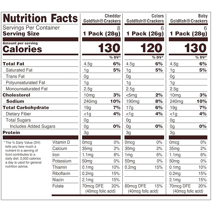 • VARIETY PACK INCLUDES 8 single-serving packs of Goldfish Cheddar, 6 packs of Goldfish Colors and 6 packs of Goldfish Baby crackers.