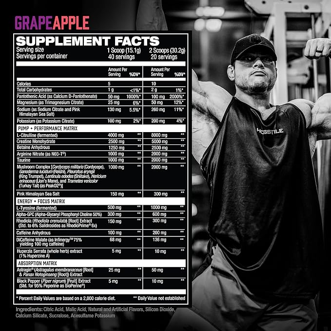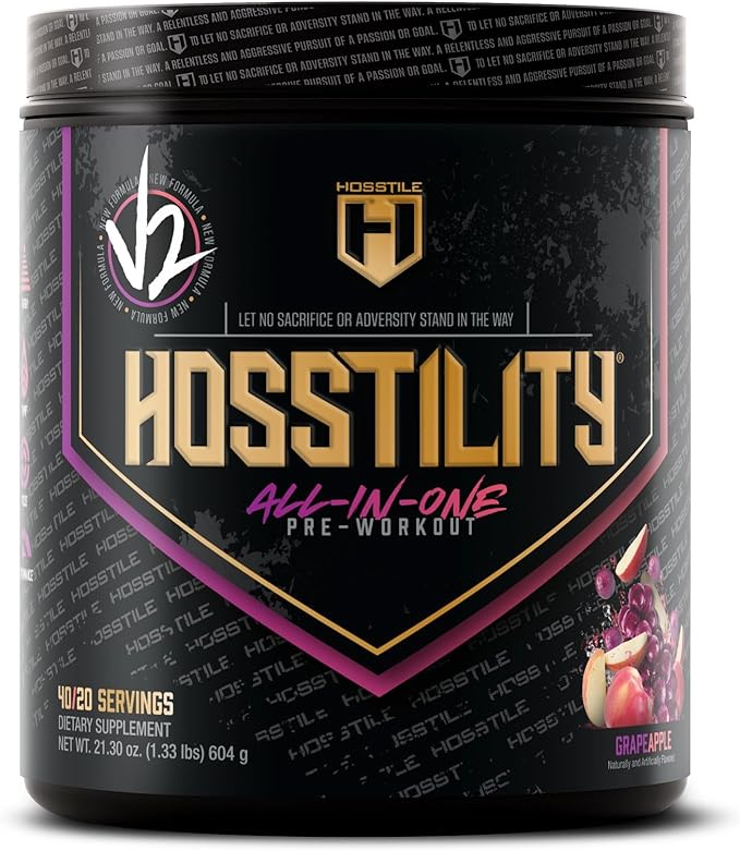 HOSSTILE Hosstility V2 Pre Workout, All-in-One Pre Workout Powder for Men and Women, Enhance Muscle Pump, Increase Energy, Boost Strength, Sharpen Focus, Grape Apple, 40 Servings