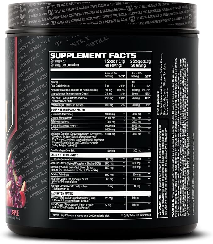 • Enhanced Energy, Focus & Drive: HOSSTILITY V2 pre-workout features six research-backed brain optimizers for peak mental performance. Alpha-GPC helps sharpen focus and is amplified by Huperzine A. RhodioPrime 6X boosts cognitive function and enhances energy and endurance, while L-Tyrosine helps replenish stress-depleted neurotransmitters. Infinergy DiCaffeine Malate and caffeine anhydrous deliver a moderate dose of caffeine, ensuring sustained energy and focus for intense training.