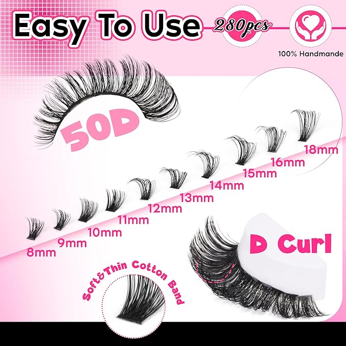 FANXITON Lash Clusters 280 Pcs Wispy Lash Clusters D 8-18 MM Mix Volume Thick Eyelash Clusters 50D Long Individual Eyelash DIY Lash Extensions at Home(50D)