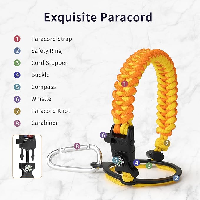 • Full-function Paracord Handle: Brilliant paracord of matching colors bring out the bottle with a touch of youthful vibe. Compact compass and handy carabiner make the bottle the ideal survival kit for expeditions in the wild