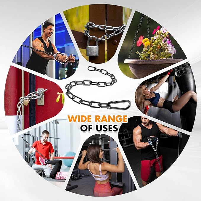 • Multi-Functionality:As a cable extension accessory for workout machine, the steel chain can be used for a variety of training programs, such as pull downs, curls, squats, hard pulls, bench presses, etc. It is suitable for use in strength racks, pulley systems, and weight lifting equipment, providing trainers with more diversified training choices. It can also be used for sandbags, locking gates or bicycles, fences and other