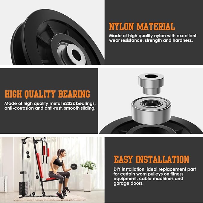 • Multiple Uses: The nylon gym pulley with bearing can be used as a replacement accessory for home gym equipment, gym tension ropes, DIY home projects, clotheslines, cable machines, garage door pulley lifting systems and more