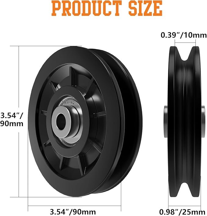 • Size: This universal pulley is 90 mm (3.54 inches) in diameter; the center hole is 10 mm (0.39 inches) in diameter; the groove width is 10 mm (0.39 inches)