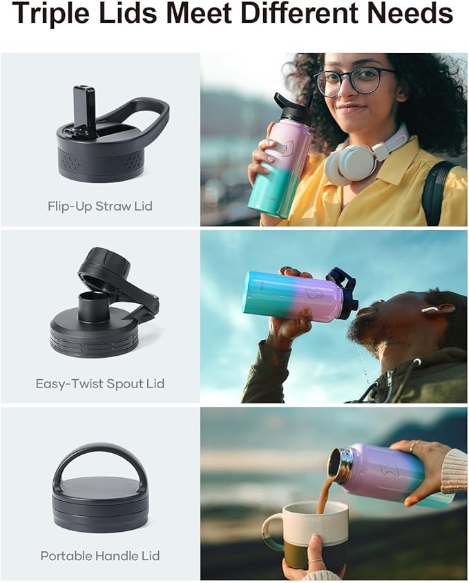 • Super Deal Combo: Buy 32oz insulated water bottle, get 7 accessories. The pack includes 1 x carrying pouch, 3 x lids, 2 x straws, and 1 x straw cleaner. This bottle is ideal for camping, hiking, cycling, running, gym sessions, or outdoor work, ensuring you stay hydrated wherever you go.