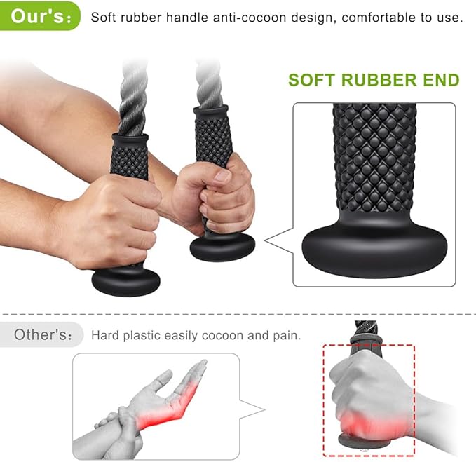 • 【Tricep Rope】The 28-inch nylon tricep rope is made of durable and abrasion-resistant material that can withstand up to 900 lbs of weight. The thermoplastic elastomer grips are soft and comfortable to hold, while the large grain texture increases grip and prevents slipping. The swivel attachment is rust-resistant and allows for smooth and flexible movement. Use the tricep rope to train your triceps, biceps, back, shoulders, abs and more