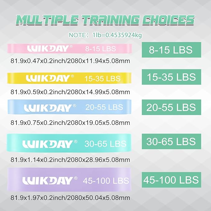 • Wide Applications: This professional exercise bands comes with 5 different levels of resistance with a new upgraded door anchor. Pastel pink(8-15 lbs), pastel yellow(15-35 lbs), pastel blue(20-55 lbs), pastel green(30-65 lbs), pastel purple(45-100 lbs). They are very suitable for beginners, fitness enthusiasts, athletes and other people