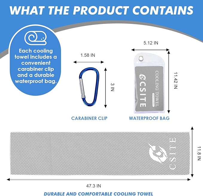 • DESIGN FEATURES : Measuring "47x12", the cooling towel offers ample coverage; Expanding the size brings better cooling effects; Crafted from high-quality materials, these towels are durable and longevity, providing a dependable, cost-effective cooling solution for the long term; Please feel free to contact us for any issues