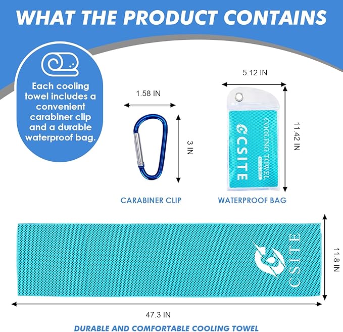 • DESIGN FEATURES : Measuring "47x12", the cooling towel offers ample coverage; Expanding the size brings better cooling effects; Crafted from high-quality materials, these towels are durable and longevity, providing a dependable, cost-effective cooling solution for the long term; Please feel free to contact us for any issues