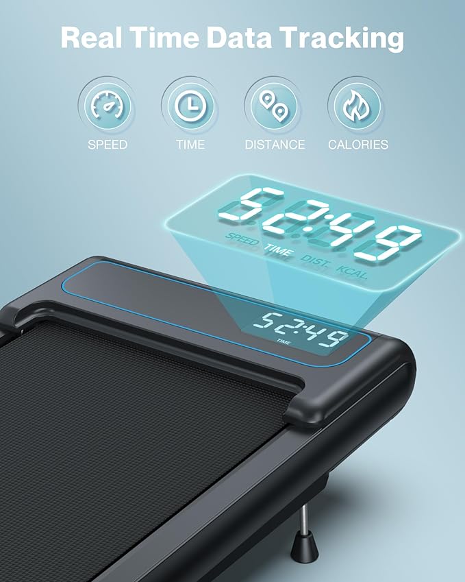 • LED Display & Remote Control: Stay informed about workout progress with LED display of the portable treadmill. It simultaneously shows to track speed, distance, time and calories in real time, it could easily adjust the speed by the super handy remote control to achieve different movements. Furthermore, its sleek design and durable construction make the treadmill a high-quality addition to your home office setup.