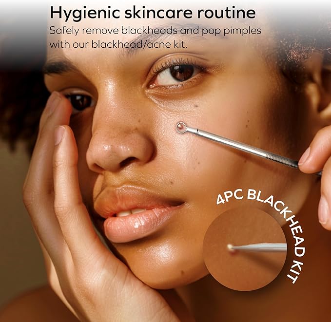 • 4-Piece Blackhead Removal Kit: Pop pimples and remove blackheads in a sterile, clean environment with the included blackhead removal kit. The kit comes with 4 stainless steel tools: an oblique loop tool, an annular loop tool, a rounded spoon tool, and a flat loop tool, all designed to remove blackheads quickly and cleanly.