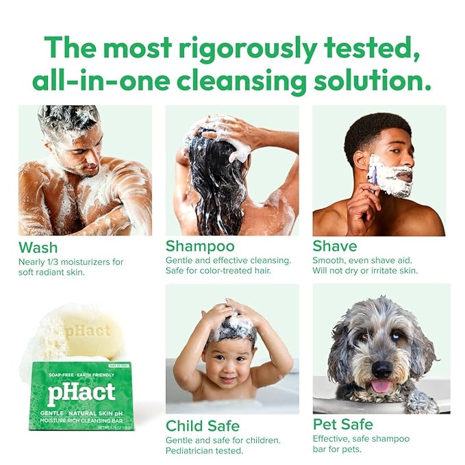 • pHact provides mild, safe and effective cleansing from head to toe for every member of the family. pHact is perfect for hands, body, face, hair and even a smooth comfortable shave. You will likely swear it is the best shampoo or shave cream you have ever used. pHact is so mild, it is perfect for children (pediatrician tested), pets and even highly sensitive skin.