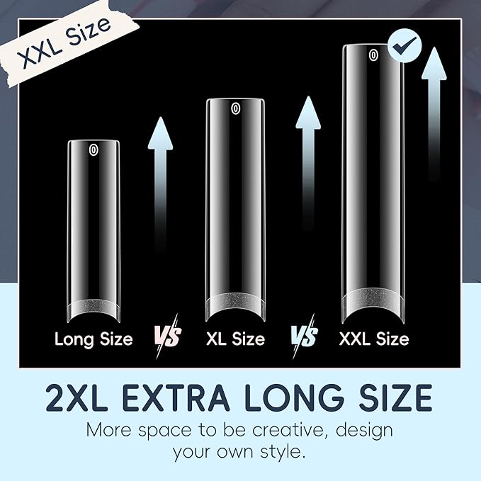 • Experiment with Different Shapes - 2XL acrylic nails offer ample length and shape, allowing you to create various types of false nails through trimming and polishing, such as coffin, ballerina, almond, French, and stiletto nails of different lengths. You can easily create your own nail art by matching different patterns and colors, effortlessly achieving salon-quality nails.