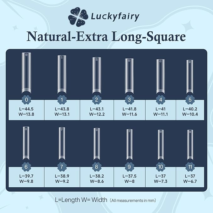 • 12 sizes of nails tips square - The transparent tips come in 12 sizes, totaling 504 tips. Additionally, there are 2 extra sizes available, catering to a wide range of hand shapes and nail sizes, ensuring everyone can find their perfect fit. Each nail tip is numbered for easy selection, reducing the time spent choosing.