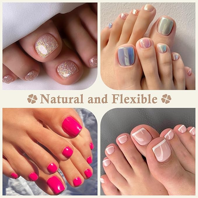• ❤️OPTIMUM TOENAIL SHAPES--Our premium short square toe gel nails have excellent softness, even bend leaving no creases, easy to shape and trim to length. Smoothly gel toe nails shapes design, thick tips is not easy to break and chip-free, thin toenail bed for better fit. No need to worry about the nails coming off.
